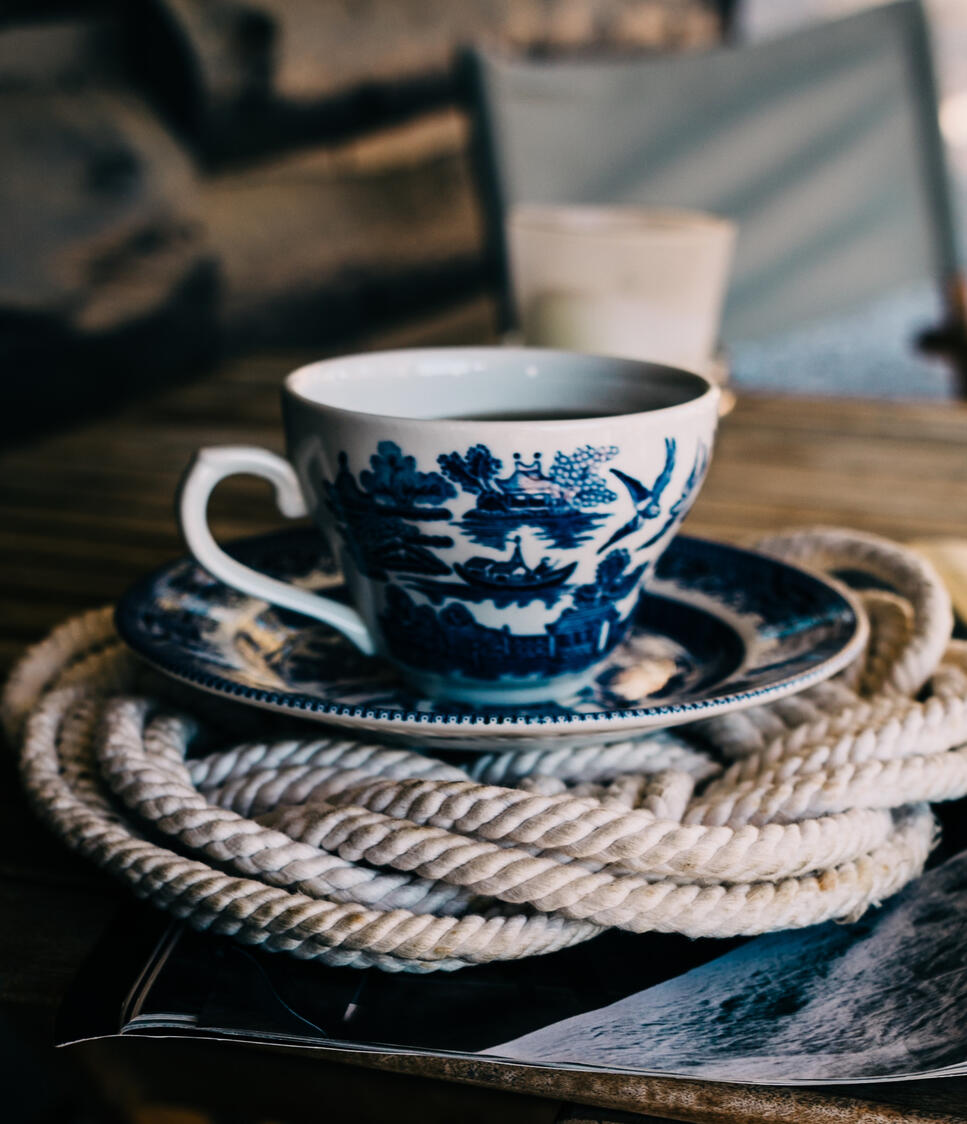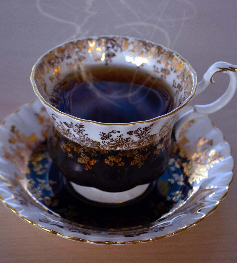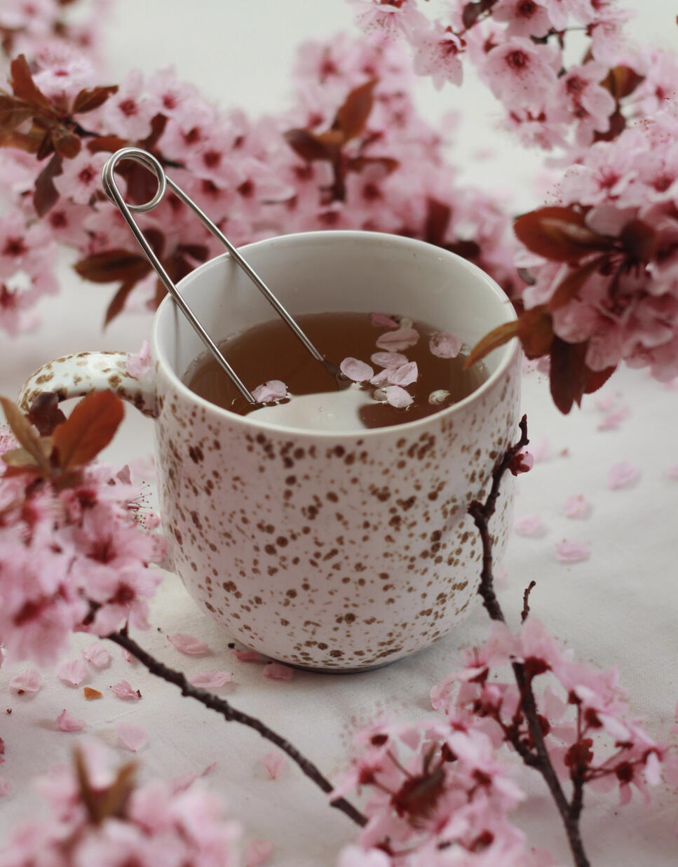 A warm, fruity tasting tea decorated with cherry blossoms on the plate around the cup to relax and calm one’s mind and body.