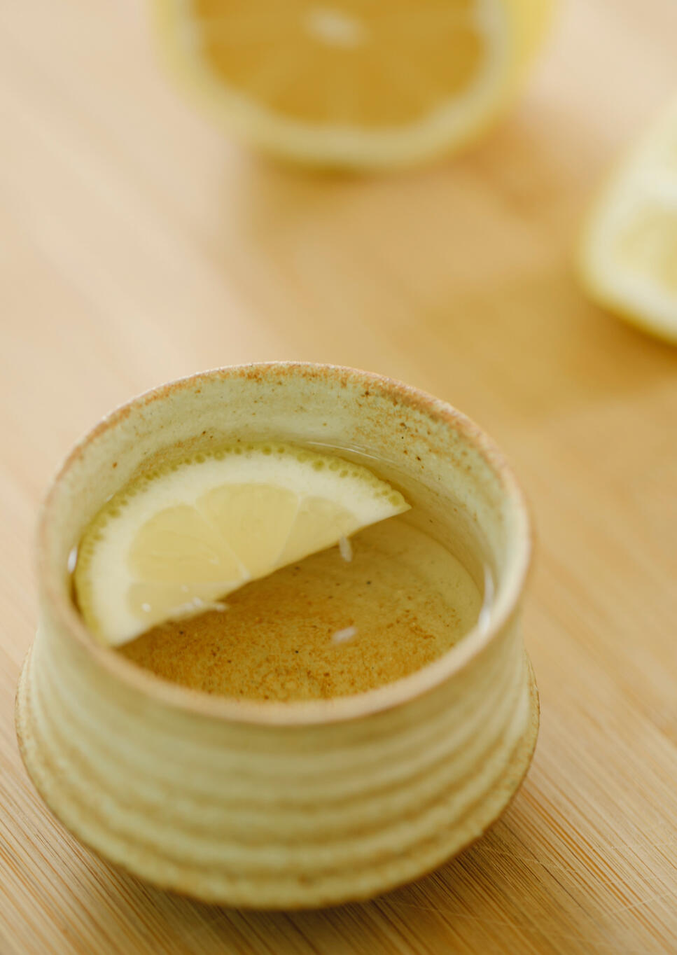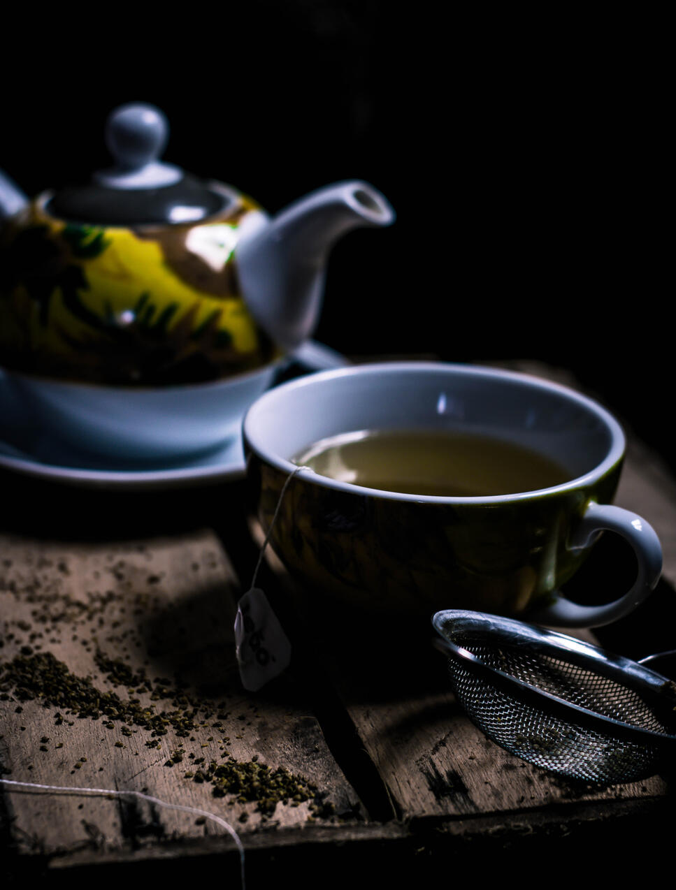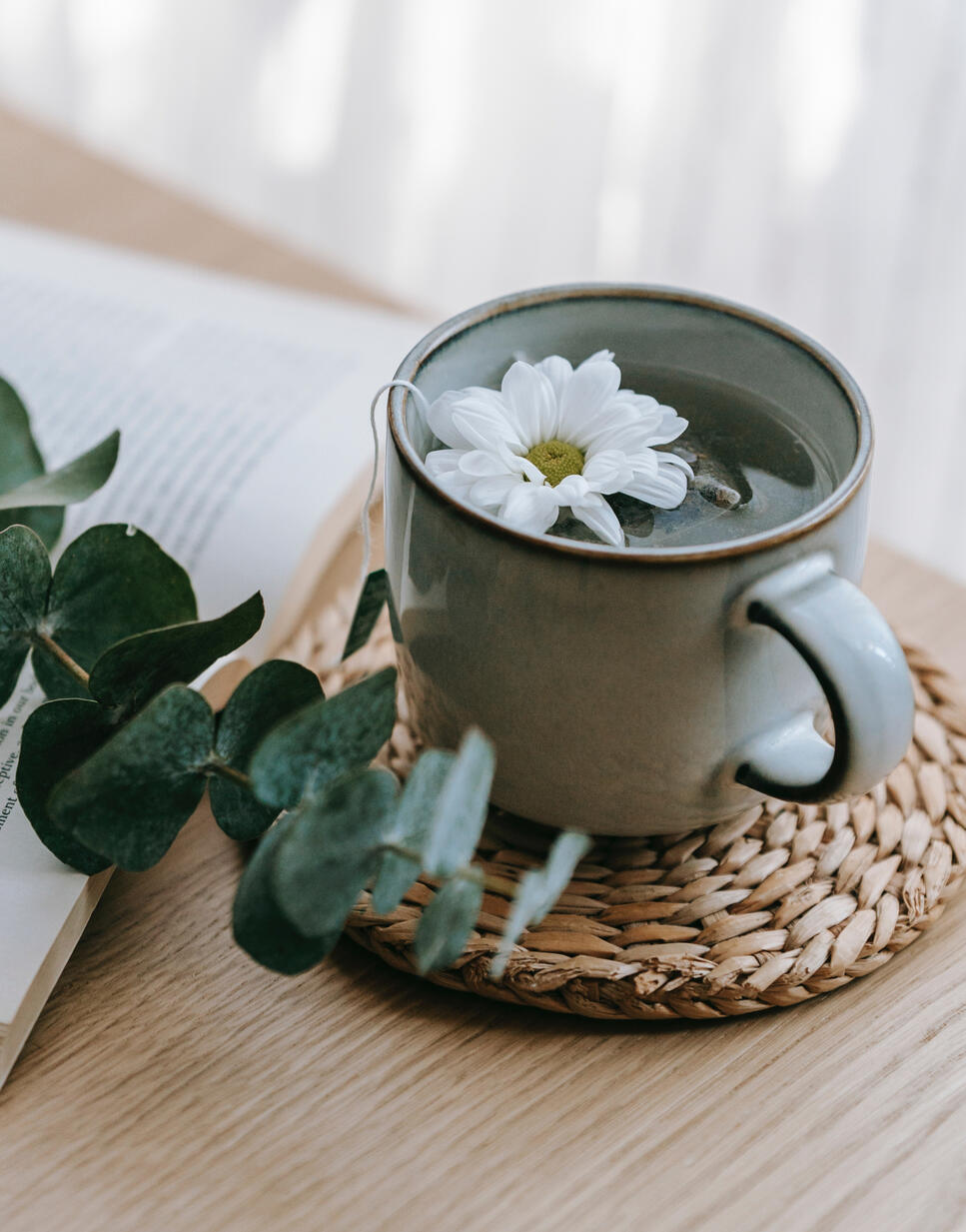 A warm, fruity tasting tea decorated with cherry blossoms on the plate around the cup to relax and calm one’s mind and body.