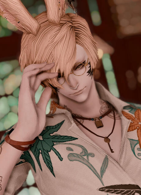 Born and raised in the wilds of the Golmore Jungle, Fen eventually made his way to Old Sharlayan, where he became a Gleaner. Once in this strange new land, Fen wanted nothing more than to document all the memories he made while traveling. And at Komorebi it's no different! You can find this blue haired bun at the reception table. Make sure to stop by for any questions, or just want to chat it up~