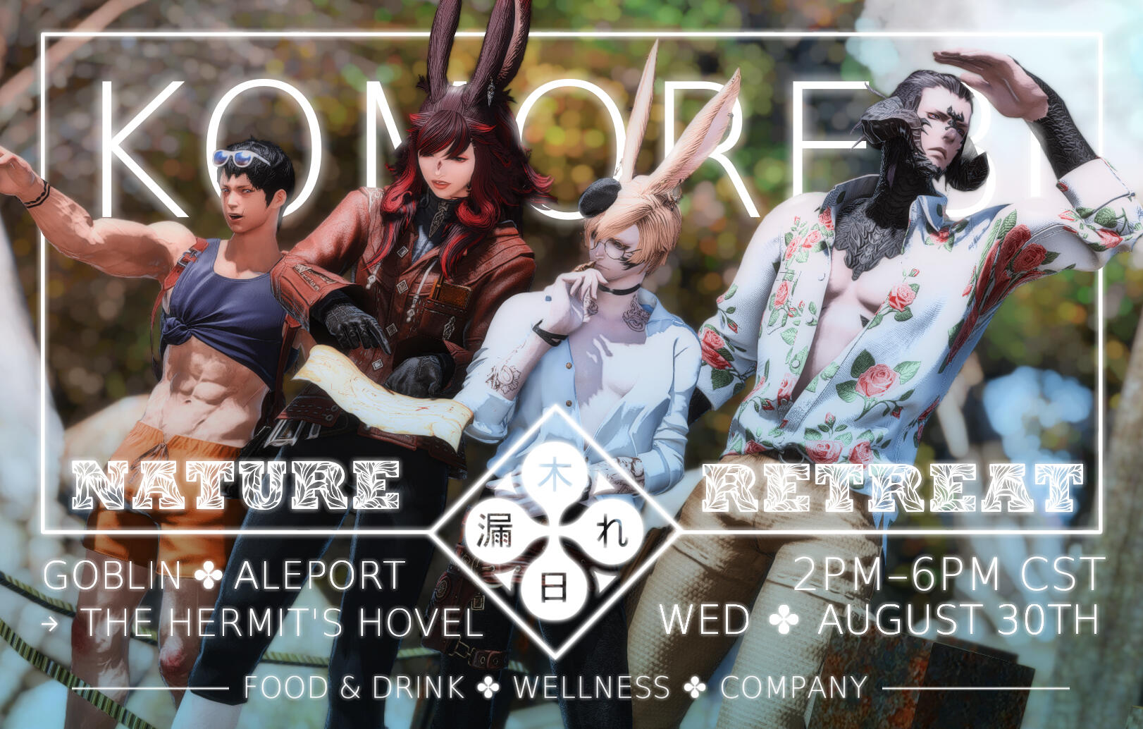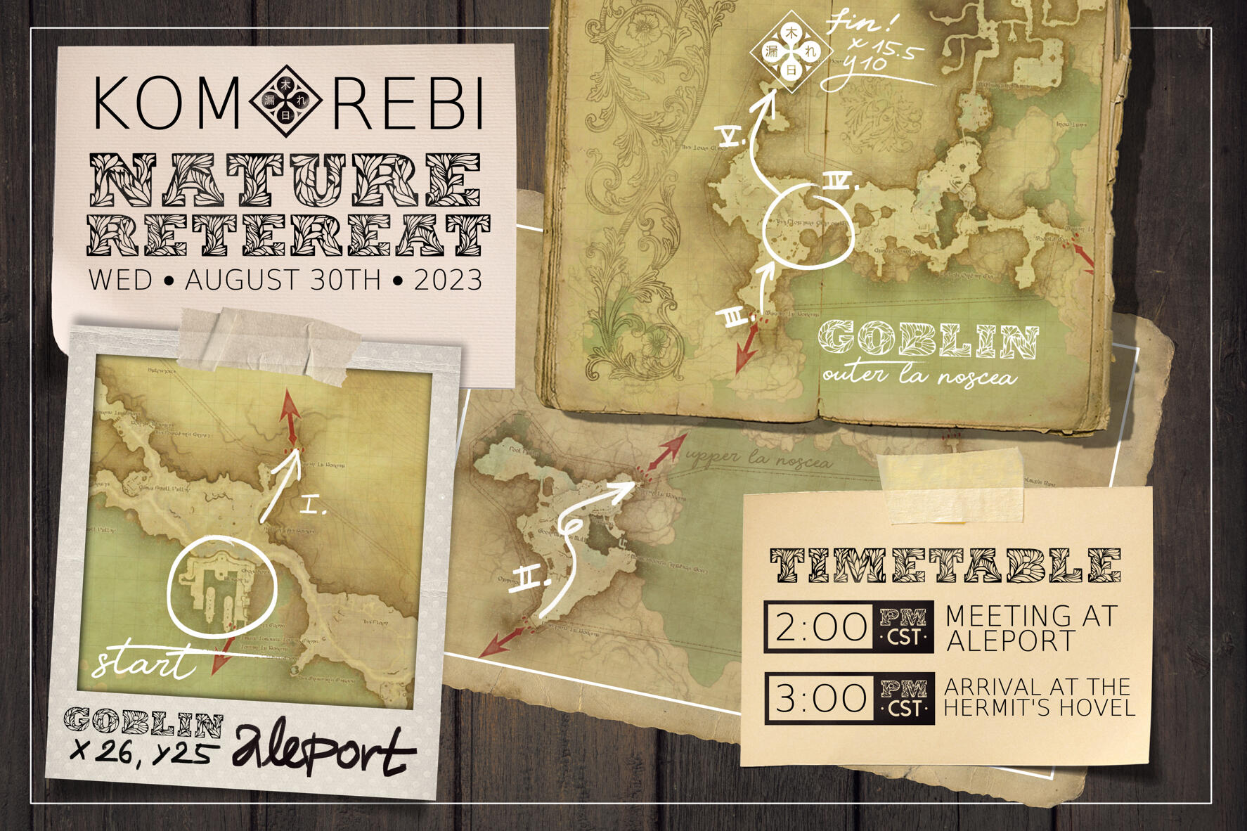 We at Komorebi are proud to present the our second annual nature retreat! This year, we'll be starting once more in Aleport, but our adventure will lead us all the way up into Outer La Noscea to the bathing spot at The Hermit's Hovel.